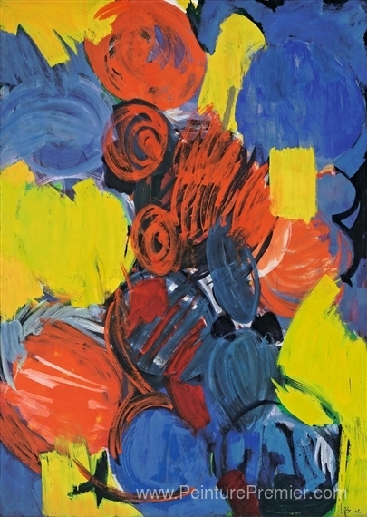 Nous vous proposons une reproduction artisanale sur toile du célèbre tableau 'Weizengelb' de Ernst Wilhelm Nay, provenant du Musée de la Reproduction.