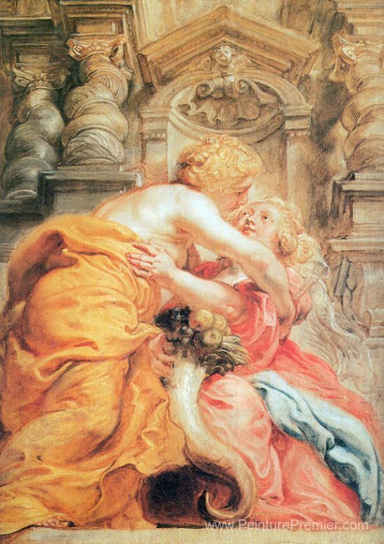 Nous vous proposons une reproduction artisanale sur toile du célèbre tableau 'Paix et abondance' de Peter Paul Rubens, provenant du Musée de la Reproduction.
