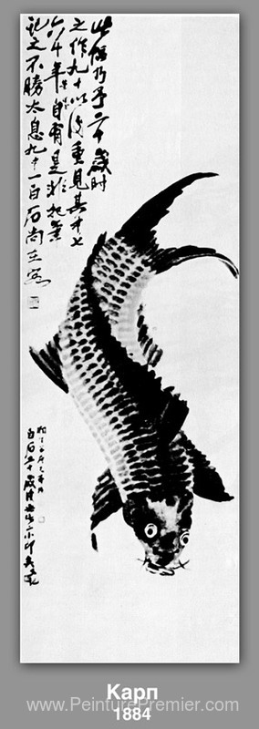 Nous vous proposons une reproduction artisanale sur toile du célèbre tableau 'Carpe' de Qi Baishi, provenant du Musée de la Reproduction.