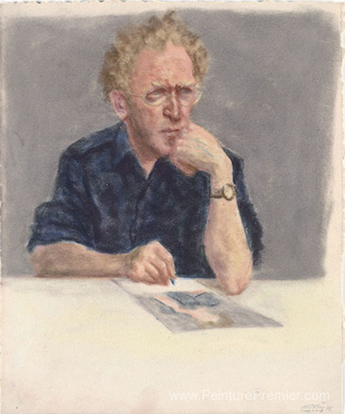 Nous vous proposons une reproduction artisanale sur toile du célèbre tableau 'Autoportrait en chemise bleue, assise, dessin' de Avigdor Arikha, provenant du Musée de la Reproduction.