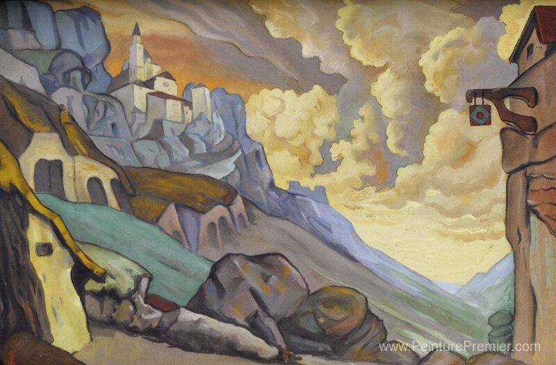 Nous vous proposons une reproduction artisanale sur toile du célèbre tableau 'Étude de la conception de la scène pour "Fuente Ovehuna"' de Nicholas Roerich, provenant du Musée de la Reproduction.