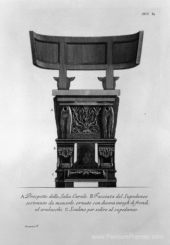 Nous vous proposons une reproduction artisanale sur toile du célèbre tableau 'Autre déclaration de la chaise CURULE, déjà illustrée dans les t' de Giovanni Battista Piranesi, provenant du Musée de la Reproduction.