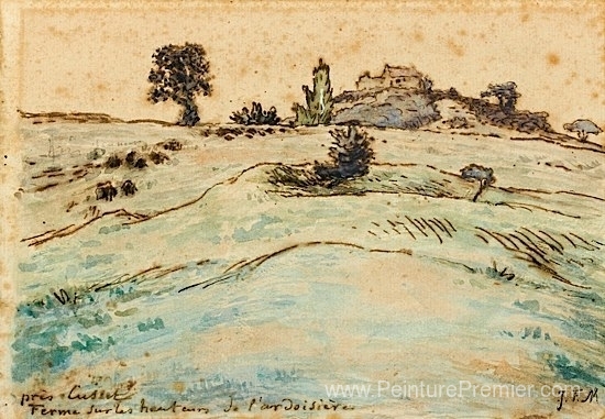 Nous vous proposons une reproduction artisanale sur toile du célèbre tableau 'Ferme sur les collines de l'Ardoisière près de Cusset' de Jean-Francois Millet, provenant du Musée de la Reproduction.