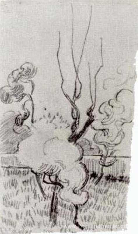 Nous vous proposons une reproduction artisanale sur toile du célèbre tableau 'Pine Trees près du mur de l'asile' de Vincent van Gogh, provenant du Musée de la Reproduction.