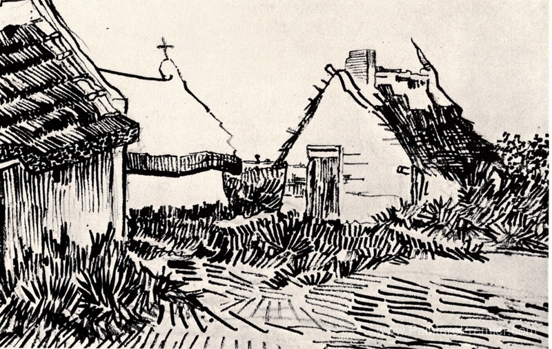 Nous vous proposons une reproduction artisanale sur toile du célèbre tableau 'Trois chalets dans les Saites-Maries' de Vincent van Gogh, provenant du Musée de la Reproduction.