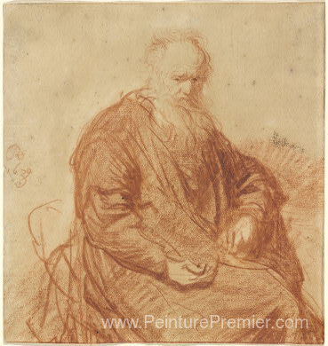 Nous vous proposons une reproduction artisanale sur toile du célèbre tableau 'Vieil homme assis' de Rembrandt, provenant du Musée de la Reproduction.