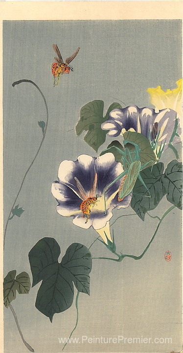 Nous vous proposons une reproduction artisanale sur toile du célèbre tableau 'Guêpes et mantes priantes' de Ohara Koson, provenant du Musée de la Reproduction.