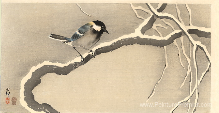 Nous vous proposons une reproduction artisanale sur toile du célèbre tableau 'Tit géant sur la branche enneigée' de Ohara Koson, provenant du Musée de la Reproduction.