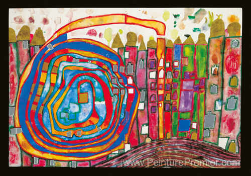Nous vous proposons une reproduction artisanale sur toile du célèbre tableau '970 qui a mangé toutes mes fenêtres' de Friedensreich Hundertwasser, provenant du Musée de la Reproduction.