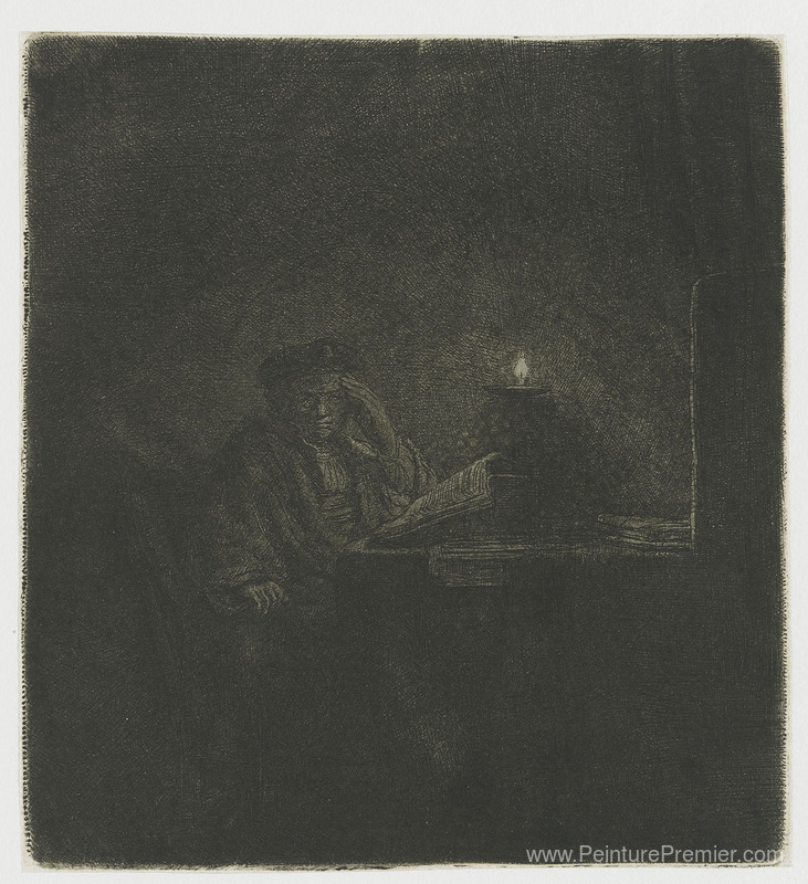 Nous vous proposons une reproduction artisanale sur toile du célèbre tableau 'Élève à une table aux chandelles' de Rembrandt, provenant du Musée de la Reproduction.
