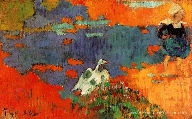 Nous vous proposons une reproduction artisanale sur toile du célèbre tableau 'Femme breton et oie au bord de l'eau' de Paul Gauguin, provenant du Musée de la Reproduction.
