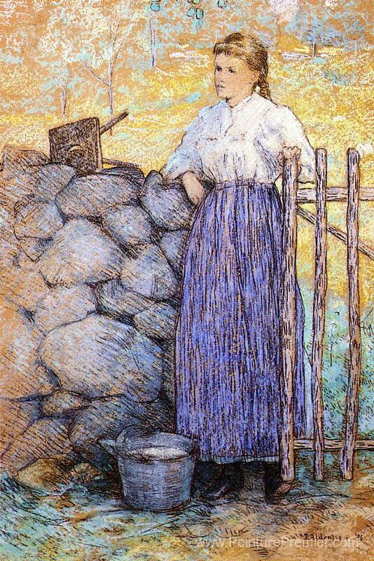 Nous vous proposons une reproduction artisanale sur toile du célèbre tableau 'Fille debout près d'une porte' de Julian Alden Weir, provenant du Musée de la Reproduction.