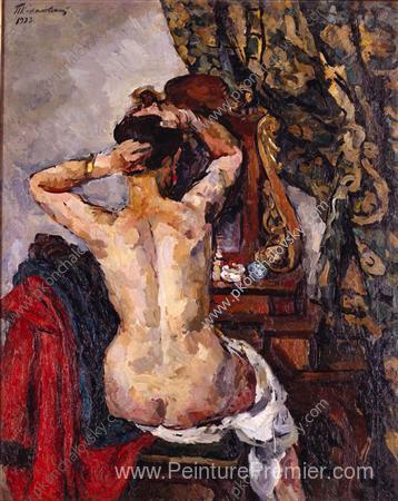 Nous vous proposons une reproduction artisanale sur toile du célèbre tableau 'La femme devant un miroir' de Pyotr Konchalovsky, provenant du Musée de la Reproduction.