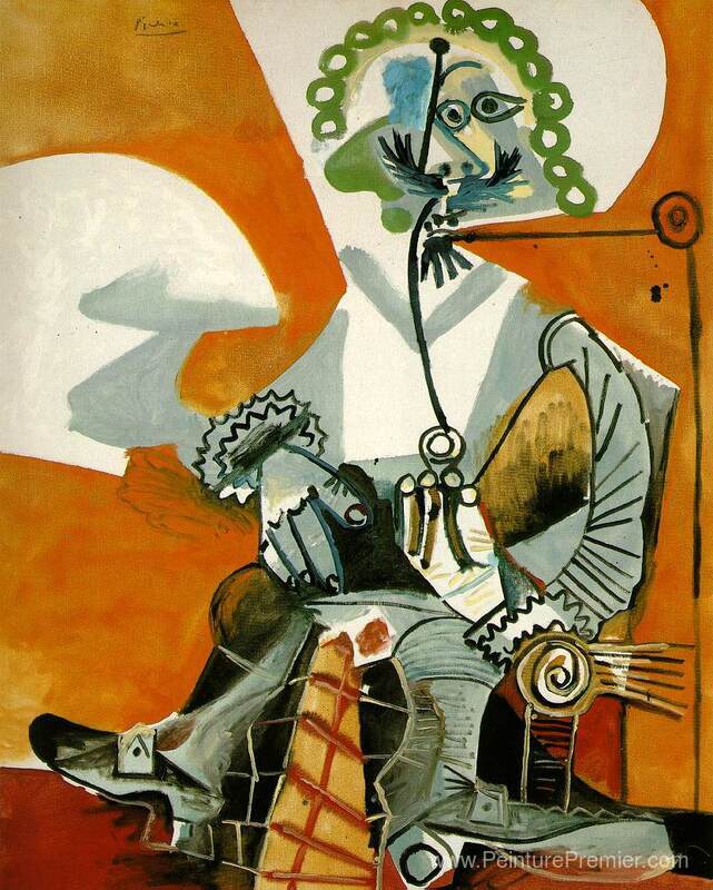 Nous vous proposons une reproduction artisanale sur toile du célèbre tableau 'L'homme avec une pipe' de Pablo Picasso, provenant du Musée de la Reproduction.