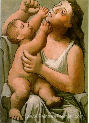 Nous vous proposons une reproduction artisanale sur toile du célèbre tableau 'Mère et l'enfant' de Pablo Picasso, provenant du Musée de la Reproduction.