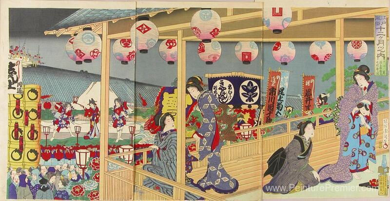 Nous vous proposons une reproduction artisanale sur toile du célèbre tableau 'Novembre: représentation à Saruwakacho' de Toyohara Chikanobu, provenant du Musée de la Reproduction.