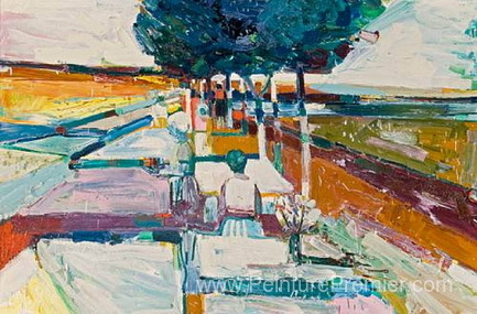 Nous vous proposons une reproduction artisanale sur toile du célèbre tableau 'Pique-nique de printemps' de Roland Petersen, provenant du Musée de la Reproduction.