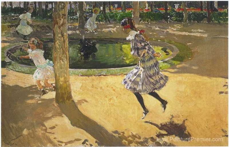 Nous vous proposons une reproduction artisanale sur toile du célèbre tableau 'Sauter la corde à La Granja' de Joaquín Sorolla, provenant du Musée de la Reproduction.