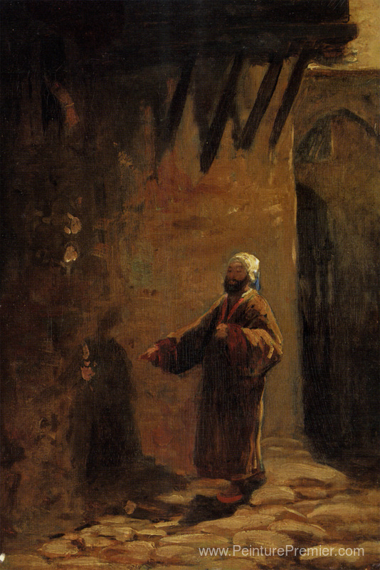 Nous vous proposons une reproduction artisanale sur toile du célèbre tableau 'Turc dans Enger Gasse' de Carl Spitzweg, provenant du Musée de la Reproduction.