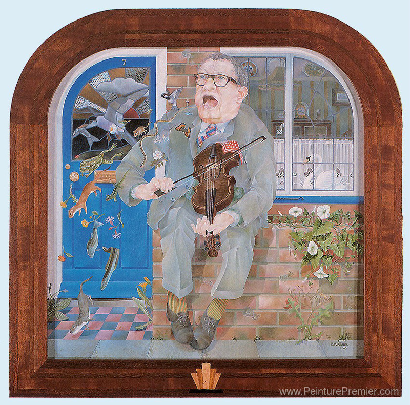 Nous vous proposons une reproduction artisanale sur toile du célèbre tableau 'Chant de l'été' de Kit Williams, provenant du Musée de la Reproduction.