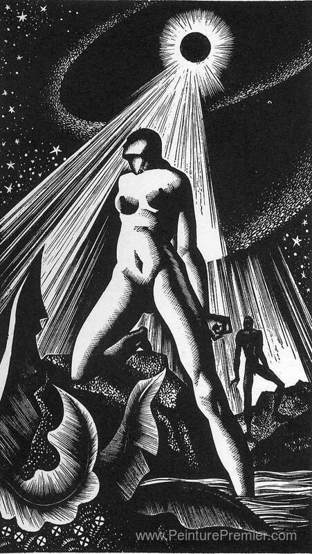 Nous vous proposons une reproduction artisanale sur toile du célèbre tableau 'Illustration de Moloch d'Alan Ginsberg à l'habitude de typograph' de Lynd Ward, provenant du Musée de la Reproduction.