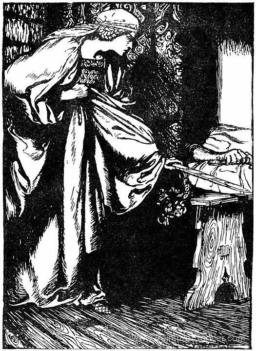 Nous vous proposons une reproduction artisanale sur toile du célèbre tableau 'Isolde découvre l'encoche dans l'épée de Tristan' de Arthur Rackham, provenant du Musée de la Reproduction.
