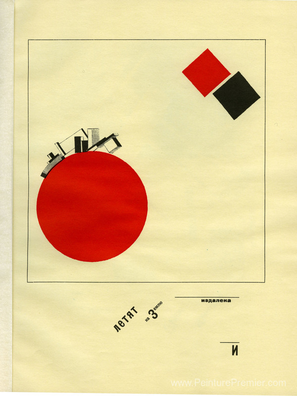 Nous vous proposons une reproduction artisanale sur toile du célèbre tableau 'Voler vers la Terre à distance' de El Lissitzky, provenant du Musée de la Reproduction.