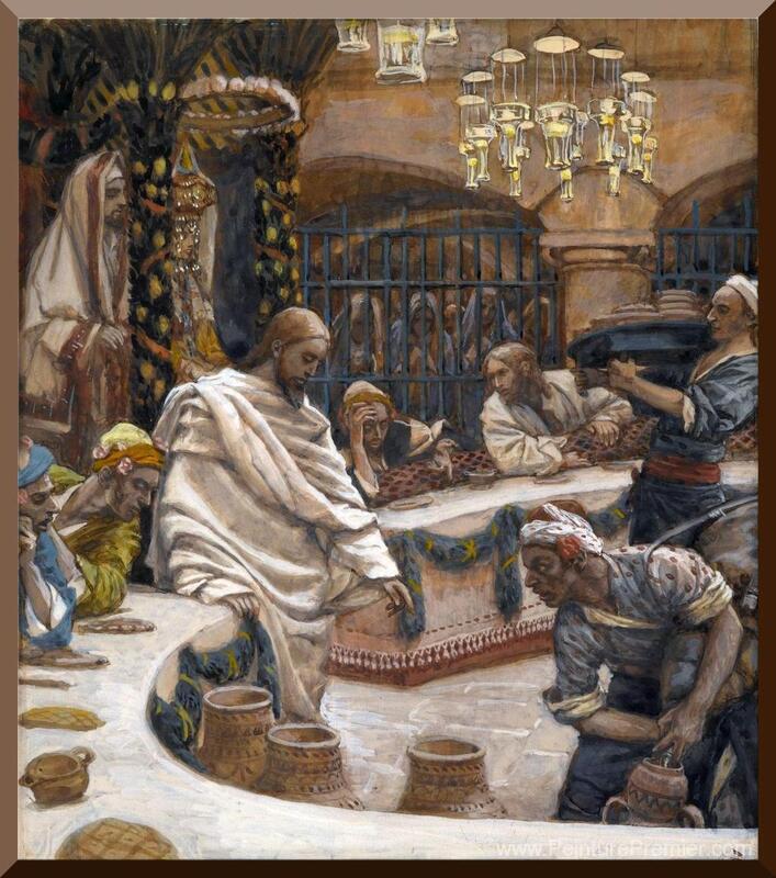 Nous vous proposons une reproduction artisanale sur toile du célèbre tableau 'Mariage à Cana' de James Tissot, provenant du Musée de la Reproduction.