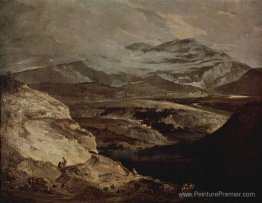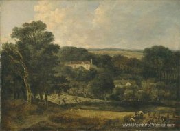 Un ruisseau, un pont, des arbres et deux figures dans un paysage