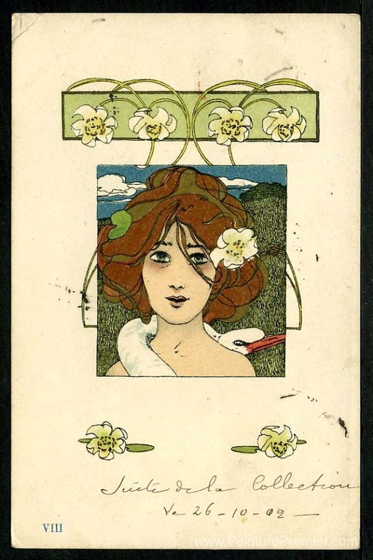 Nous vous proposons une reproduction artisanale sur toile du célèbre tableau 'Leda et le cygne' de Raphael Kirchner, provenant du Musée de la Reproduction.