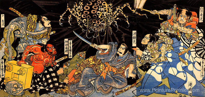 Nous vous proposons une reproduction artisanale sur toile du célèbre tableau 'Raiko tourmenté par l'araignée de la Terre' de Utagawa Kuniyoshi, provenant du Musée de la Reproduction.