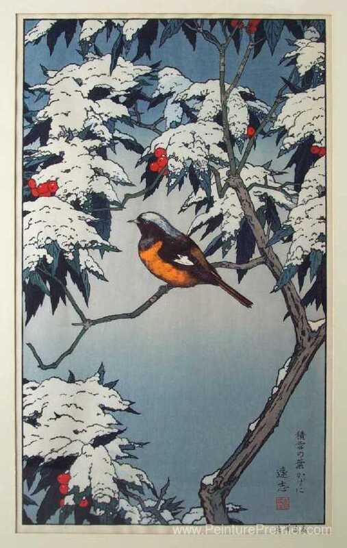 Nous vous proposons une reproduction artisanale sur toile du célèbre tableau 'Oiseaux des saisons - hiver' de Toshi Yoshida, provenant du Musée de la Reproduction.