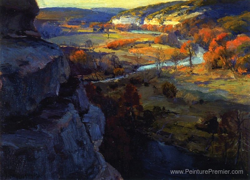 Nous vous proposons une reproduction artisanale sur toile du célèbre tableau 'Bluffs sur le Riiver Guadalupe, à 17 miles au-dessus de Kerryvil' de Robert Julian Onderdonk, provenant du Musée de la Reproduction.