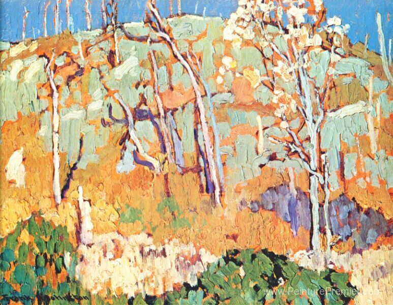 Nous vous proposons une reproduction artisanale sur toile du célèbre tableau 'Colline à motifs' de Frank Johnston, provenant du Musée de la Reproduction.