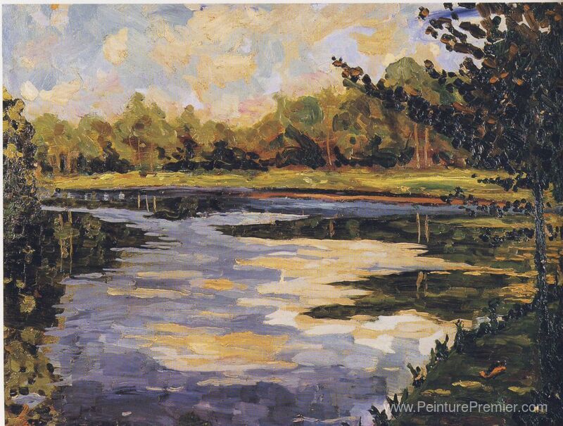 Nous vous proposons une reproduction artisanale sur toile du célèbre tableau 'Lac près de Breccles en automne' de Winston Churchill, provenant du Musée de la Reproduction.