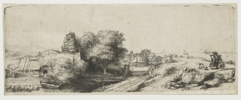 Nous vous proposons une reproduction artisanale sur toile du célèbre tableau 'Paysage avec un pêcheur' de Rembrandt, provenant du Musée de la Reproduction.