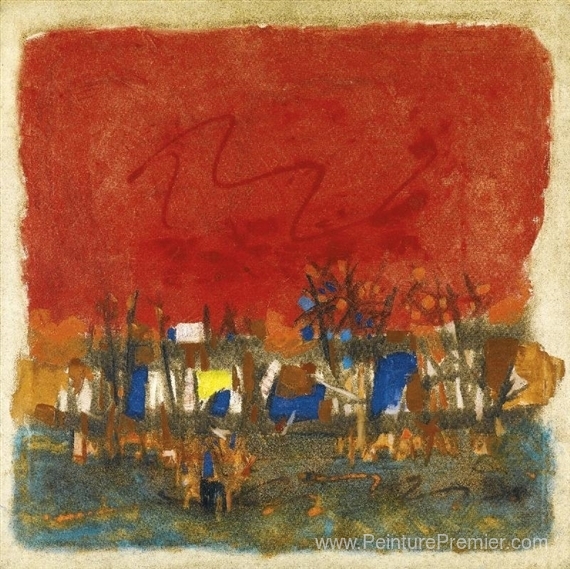 Nous vous proposons une reproduction artisanale sur toile du célèbre tableau 'Paysage rouge' de M.F. Husain, provenant du Musée de la Reproduction.