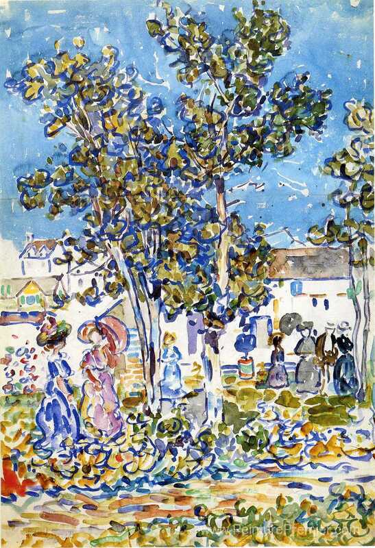Nous vous proposons une reproduction artisanale sur toile du célèbre tableau 'Promenade du printemps' de Maurice Prendergast, provenant du Musée de la Reproduction.