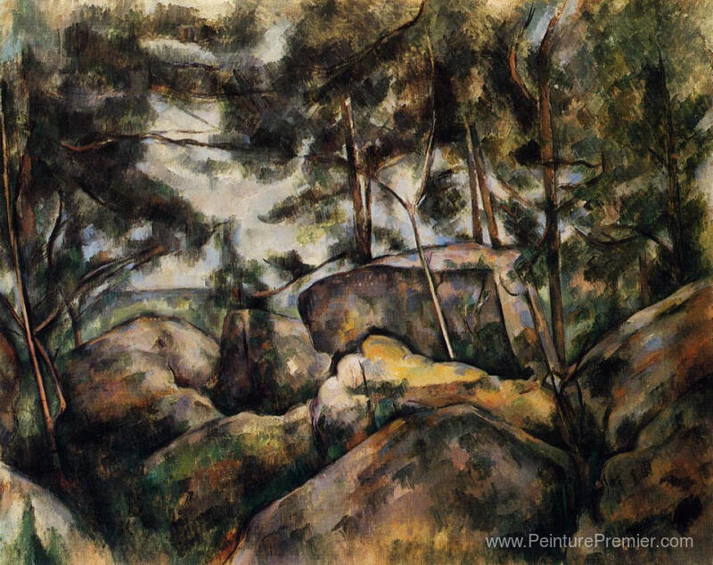 Nous vous proposons une reproduction artisanale sur toile du célèbre tableau 'Roches à Fountainebleau' de Paul Cezanne, provenant du Musée de la Reproduction.