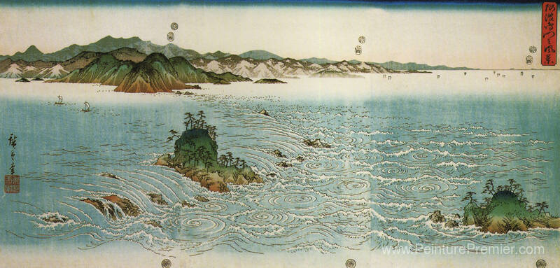 Nous vous proposons une reproduction artisanale sur toile du célèbre tableau 'Tourbillon sur une côte rocheuse' de Hiroshige, provenant du Musée de la Reproduction.