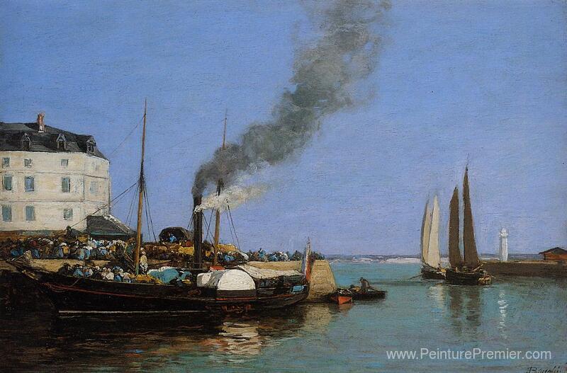 Nous vous proposons une reproduction artisanale sur toile du célèbre tableau 'Honfleur. La Jetee' de Eugene Boudin, provenant du Musée de la Reproduction.