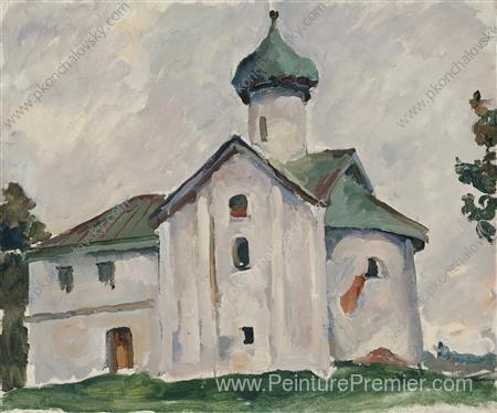 Nous vous proposons une reproduction artisanale sur toile du célèbre tableau 'Novgorod. L'église.' de Pyotr Konchalovsky, provenant du Musée de la Reproduction.
