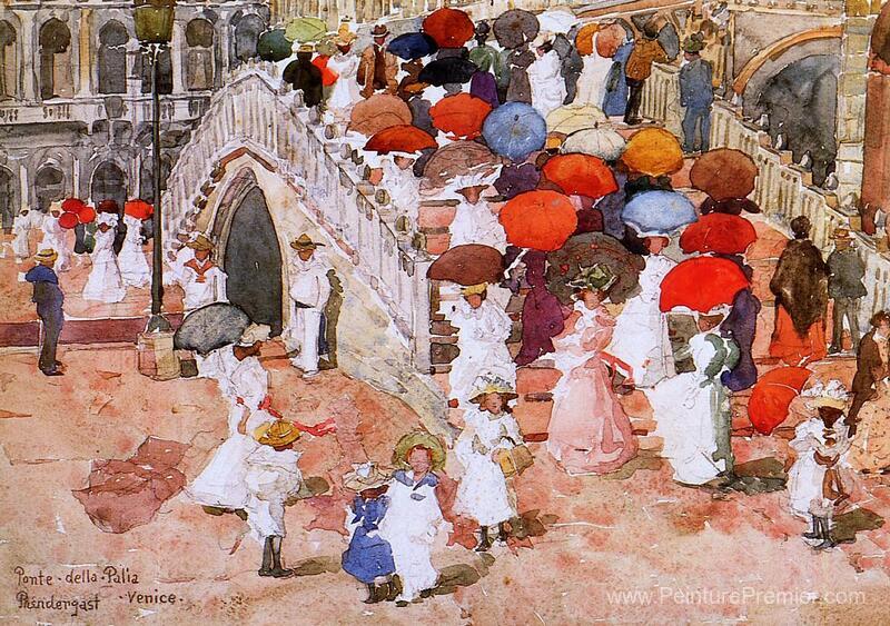 Nous vous proposons une reproduction artisanale sur toile du célèbre tableau 'Ponte della Paglia' de Maurice Prendergast, provenant du Musée de la Reproduction.