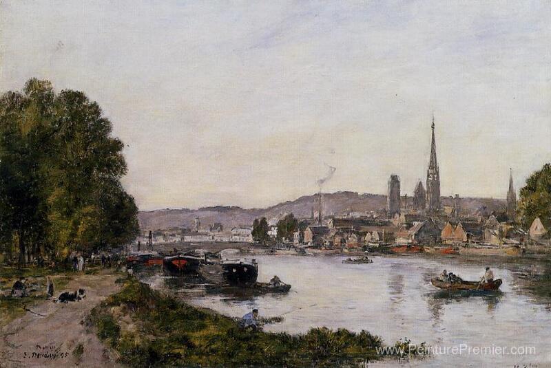 Nous vous proposons une reproduction artisanale sur toile du célèbre tableau 'Rouen, vue sur la Seine de la rivière' de Eugene Boudin, provenant du Musée de la Reproduction.