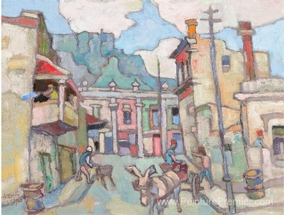 Nous vous proposons une reproduction artisanale sur toile du célèbre tableau 'Tiepiese Toneel dans Dist. Ses rencontré Tafelberg en Donkie Kar' de Gregoire Boonzaier, provenant du Musée de la Reproduction.