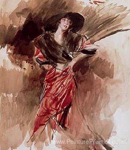 Nous vous proposons une reproduction artisanale sur toile du célèbre tableau 'Dame en robe rouge' de Giovanni Boldini, provenant du Musée de la Reproduction.