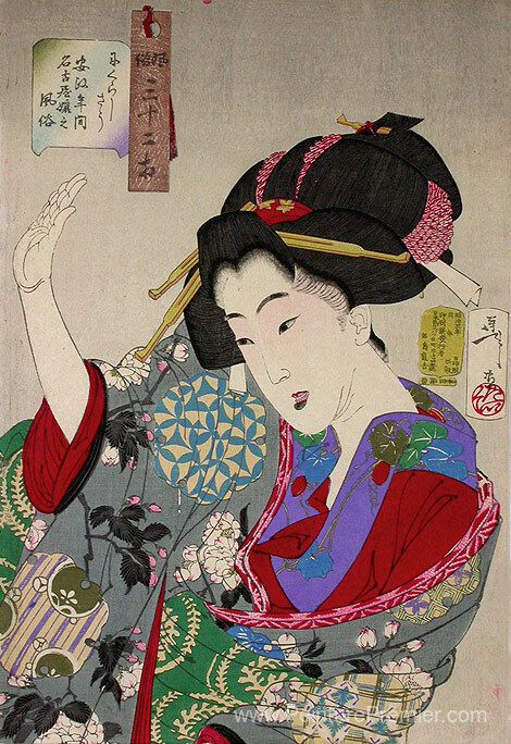 Nous vous proposons une reproduction artisanale sur toile du célèbre tableau 'L'air désagréable - l'apparition d'une jeune femme de Nagoya pen' de Tsukioka Yoshitoshi, provenant du Musée de la Reproduction.