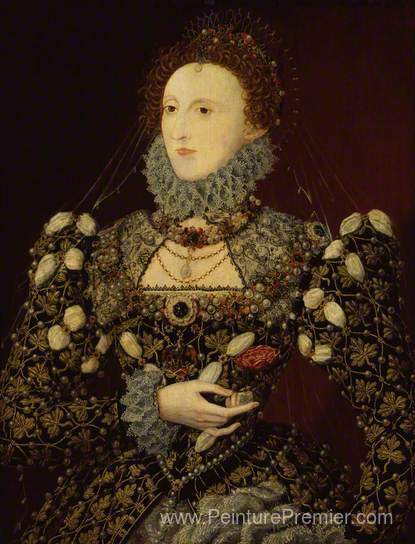 Nous vous proposons une reproduction artisanale sur toile du célèbre tableau 'Reine Elizabeth I' de Nicholas Hilliard, provenant du Musée de la Reproduction.