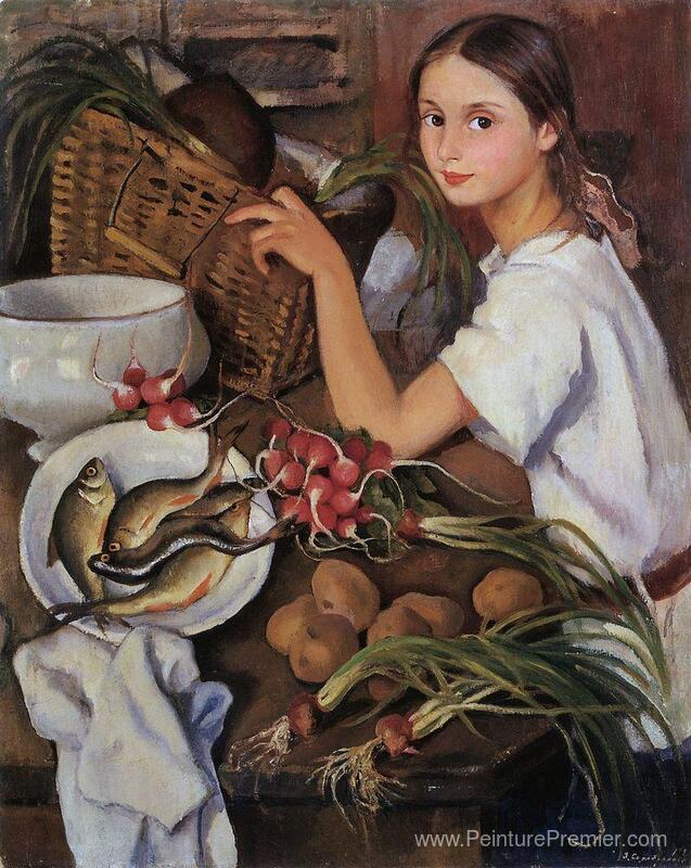 Nous vous proposons une reproduction artisanale sur toile du célèbre tableau 'Tata avec des légumes' de Zinaida Serebriakova, provenant du Musée de la Reproduction.
