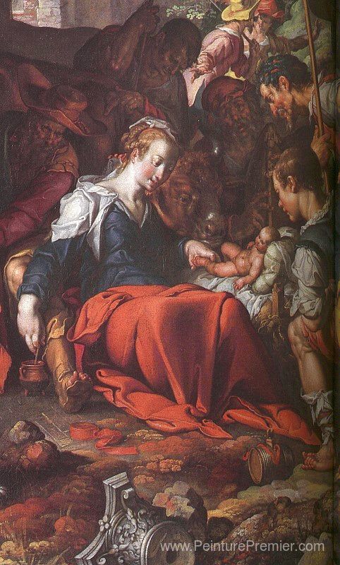 Nous vous proposons une reproduction artisanale sur toile du célèbre tableau 'Adoration des bergers (détail)' de Joachim Wtewael, provenant du Musée de la Reproduction.